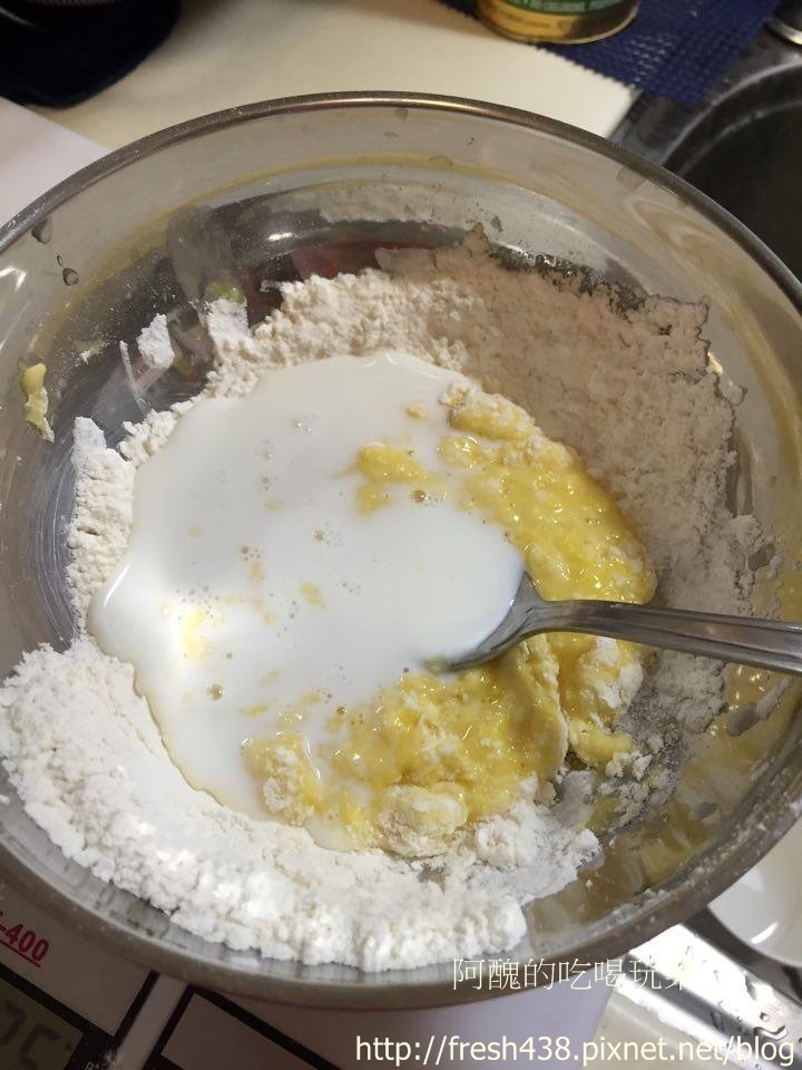 將低筋麵粉、雞蛋、牛奶和清水倒入碗中,